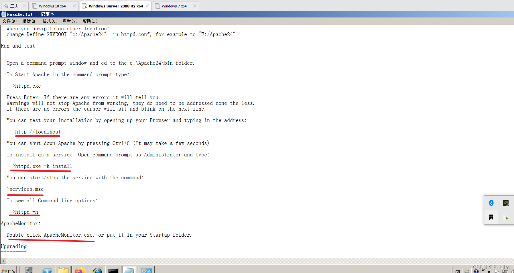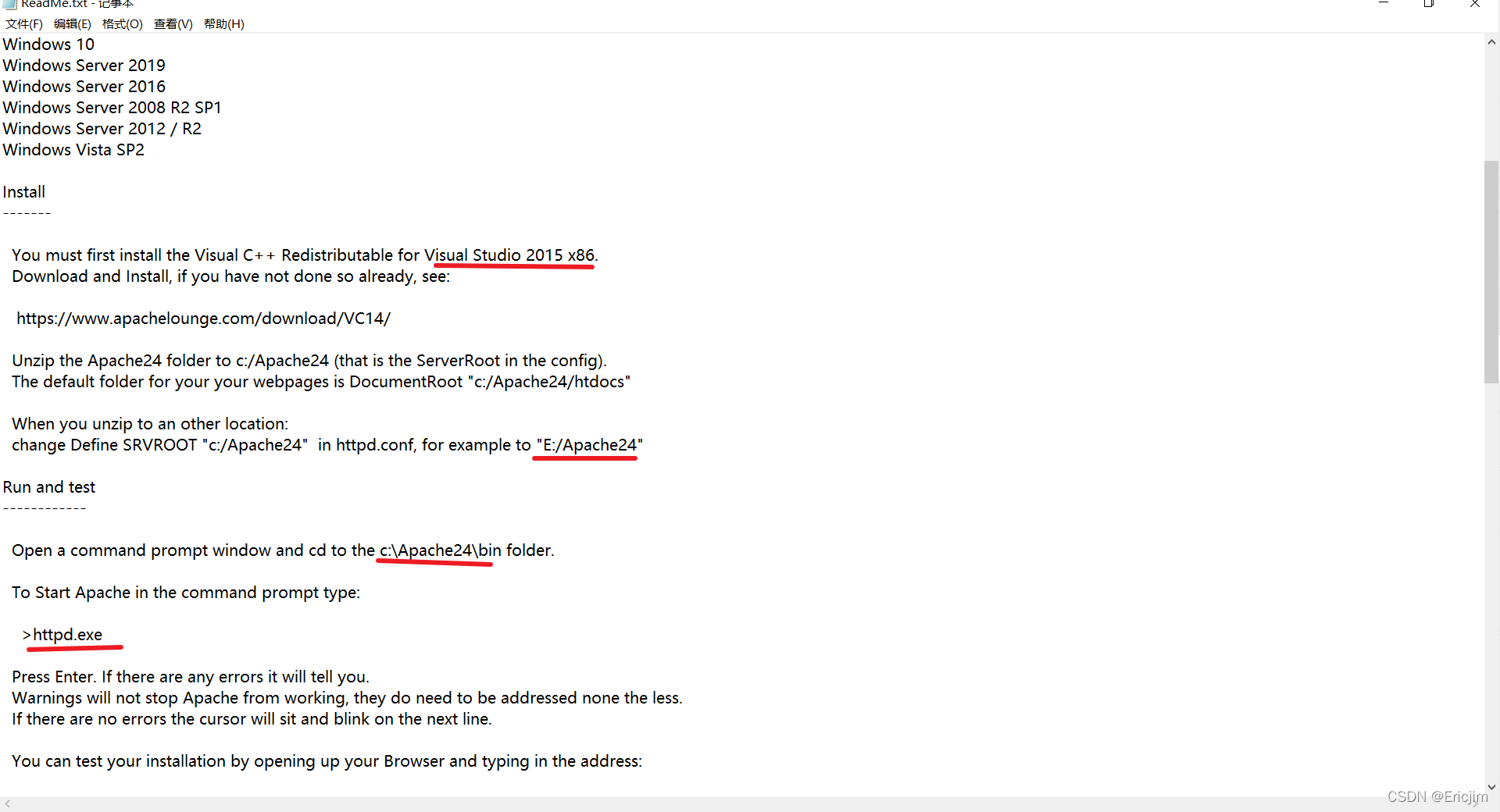 但是Apache这里是绿色版的,还需要进行配置,才能让Apache启动:具体参考官网附带的readme文件: