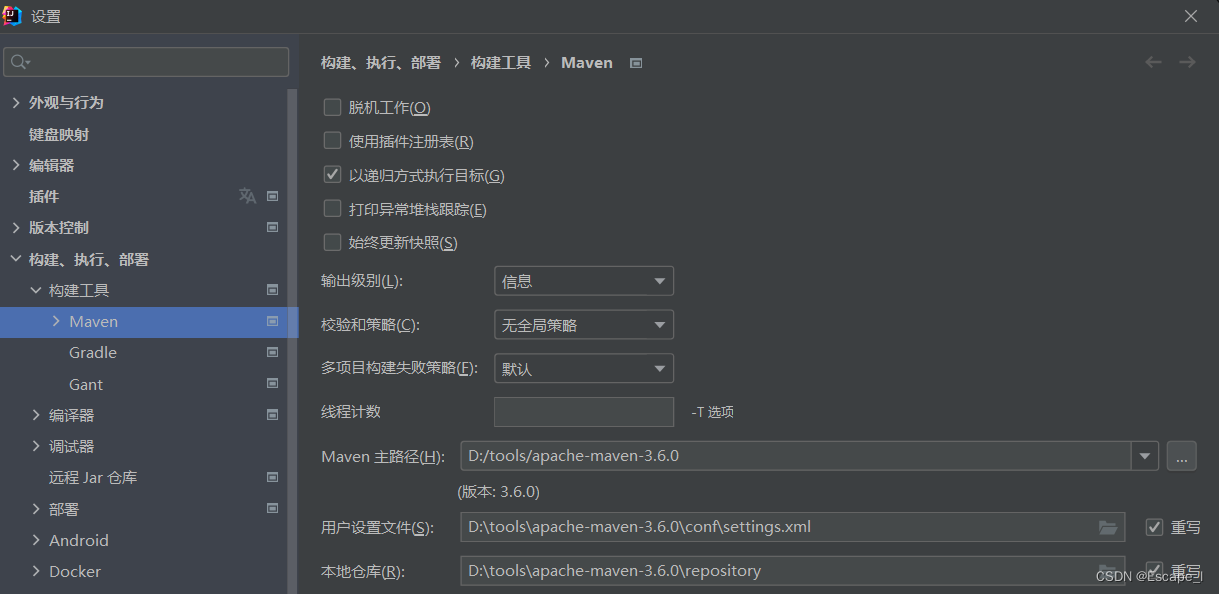 Maven 是一种声明式项目管理工具,通过在 POM 中配置 "who","what","where"等信息,即可满足编译、测试、打包、发布等项目构建需求。 若果想在Idea中使用Maven,就需要解压官方Maven包到主机中并打开Idea设置将Maven主路径、用户设置文件、本地仓库重新配置为自己安装maven的相应路径上:
