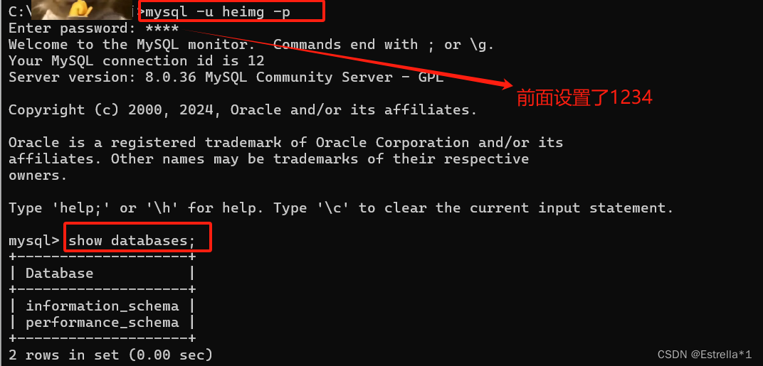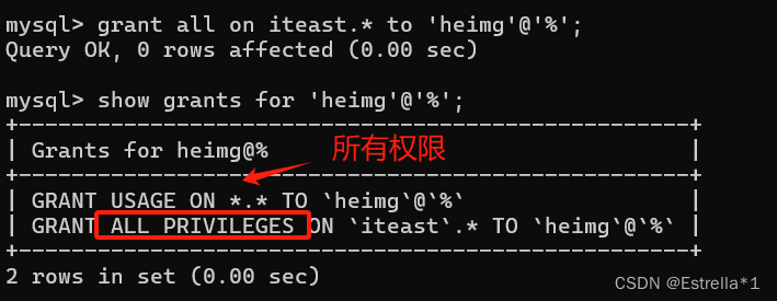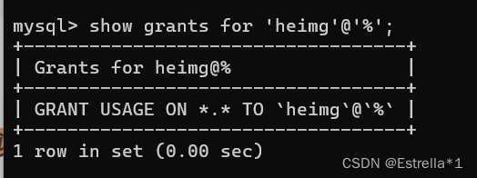 重新打开一个mysql,登录heimg用户,在heimg用户中查看权限