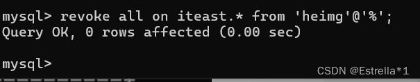 (3)撤销权限:REVOKE 权限列表 ON 数据库名.表名 FROM '用户名'@'主机名';