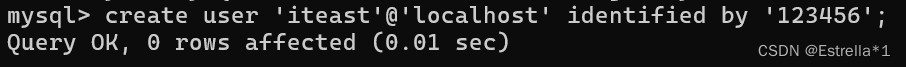 1、创建用户 iteast,只能够在当前主机localhost访问,密码123456;