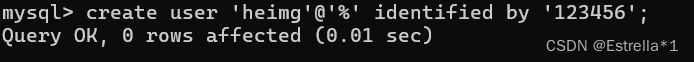 2、创建用户 heimg,可以在任意主机访问该数据库,(%代表任意主机)密码123456;