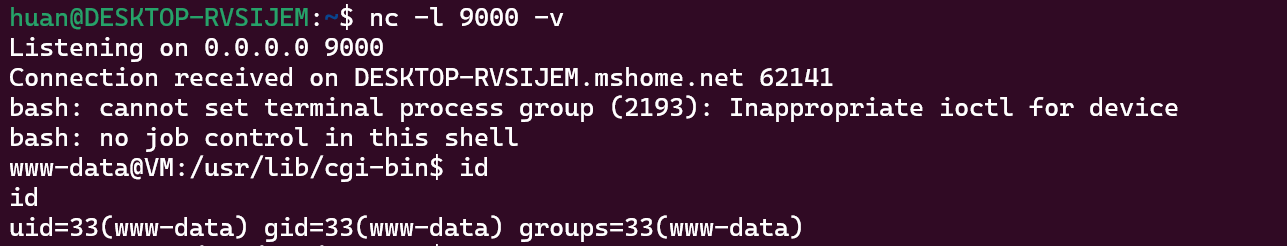 我们可以先运行/usr/bin/id程序,看看Web服务器用什么id执行(注意要查看Web服务器id,要用Web调用usr/bin/id程序,那么就可以按我们上述所述让其执行恶意命令)