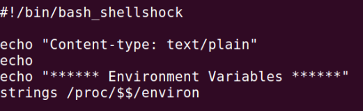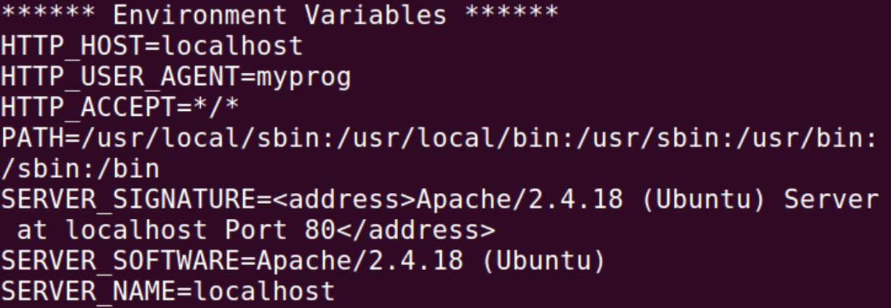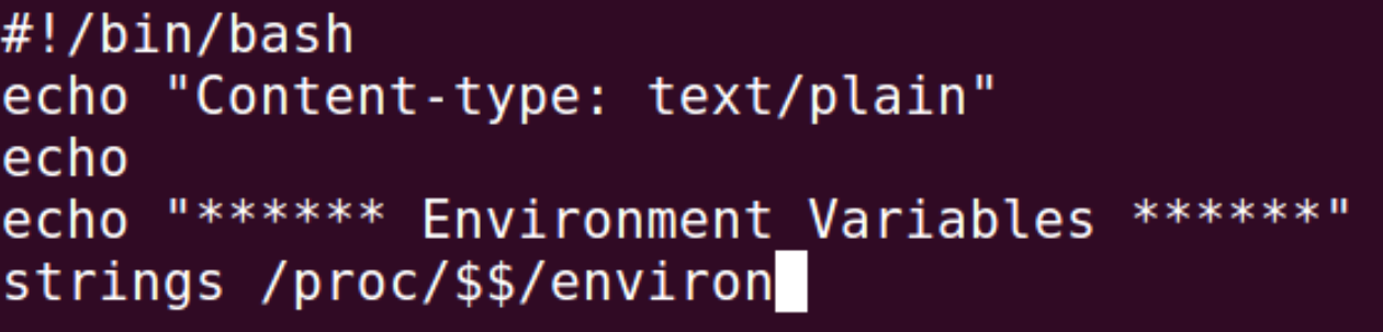 要利用基于 Bash 的 CGI 程序中的 Shellshock 漏洞,攻击者需要将他们的数据传递给易受攻击的 Bash 程序,并且这些数据需要通过环境变量传递。在这个任务中,我们需要看看如何实现这个目标。你可以使用以下 CGI 程序来演示你可以向 CGI 程序发送任意字符串,该字符串将显示在某个环境变量的内容中。