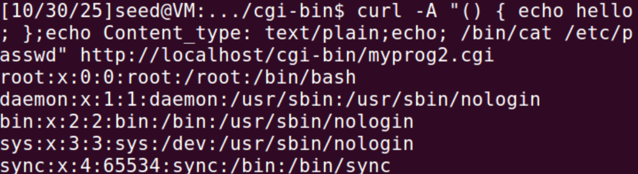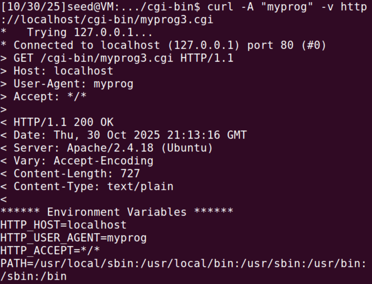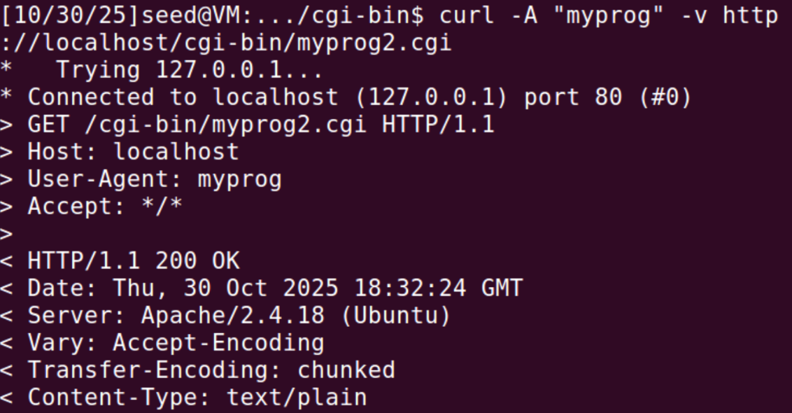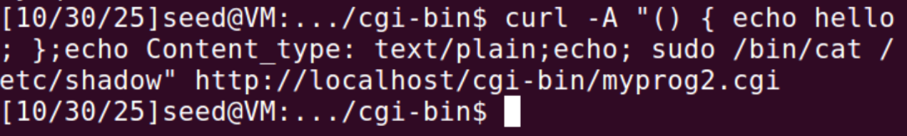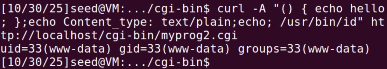 在上述 CGI 程序设置完成后,我们现在可以发起 Shellshock 攻击。该攻击并不依赖 CGI 程序中的内容,因为它针对的是 Bash 程序,而 Bash 程序会在 CGI 脚本执行之前被首先调用。你的目标是通过 URL http://localhost/cgi-bin/myprog.cgi 发起攻击,从而实现作为远程用户无法完成的操作。在此任务中,你应展示以下内容