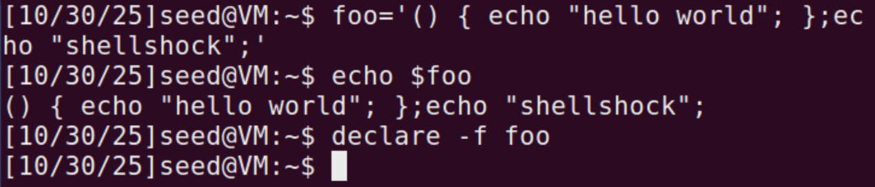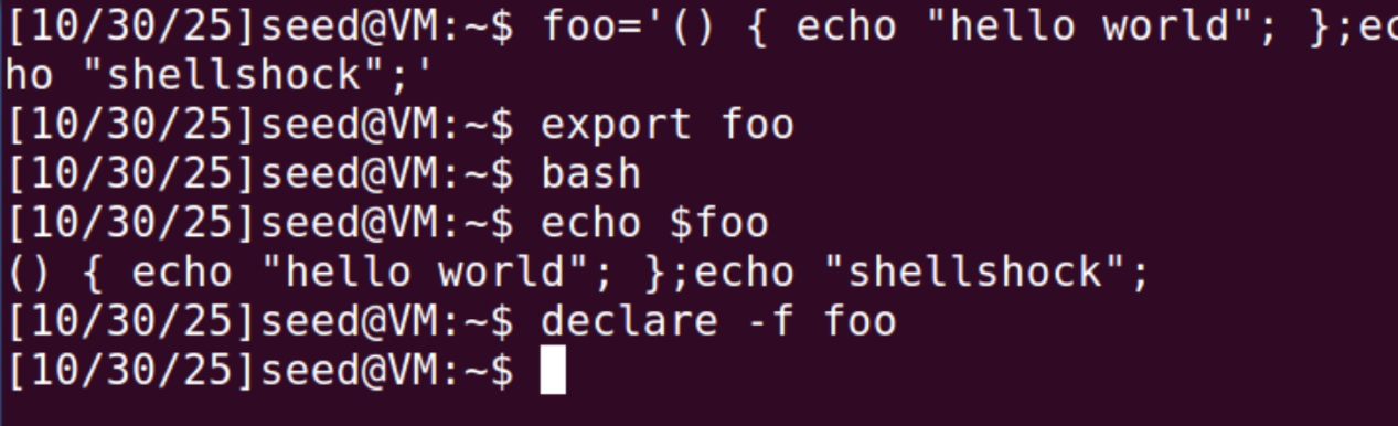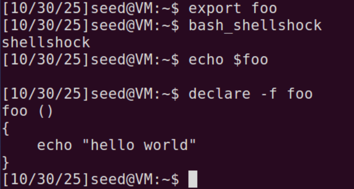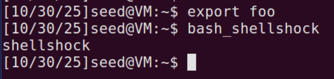 Ubuntu 16.04中的Bash程序已经打过补丁,因此不再容易受到 Shellshock 攻击。为了本实验的目的,我们在 /bin 文件夹中安装了一个易受攻击的 Bash 版本,其名称为 bash_shellshock。我们需要在任务中使用这个 Bash。请像下面这样运行这个易受攻击的 Bash,然后设计一个实验来验证该Bash是否易受 Shellshock 攻击: