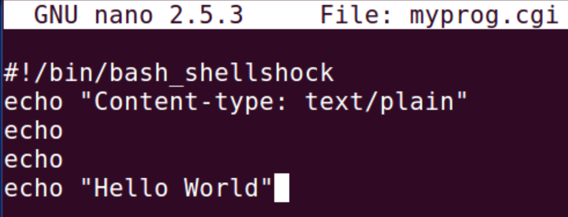 在此任务中,我们将设置一个非常简单的 CGI 程序(称为 myprog.cgi),内容如下。它只是使用 shell 脚本打印“Hello World”.