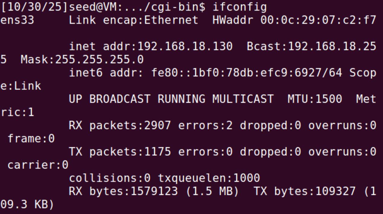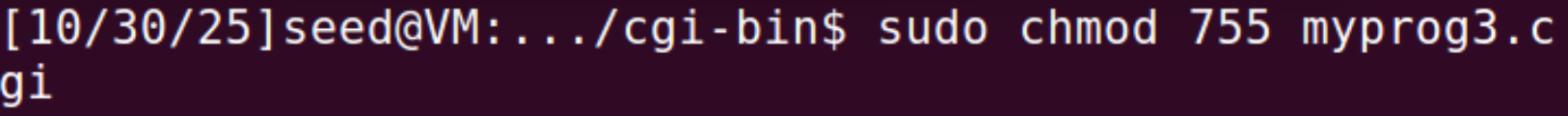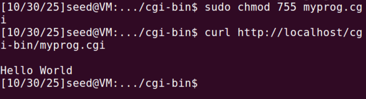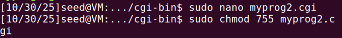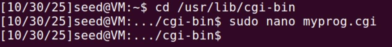 请确保在脚本的第一行使用 /bin/bash shellshock,而不是 /bin/bash。该行指定了运行脚本时应调用的 shell 程序。在本实验中,我们确实需要使用易受攻击的 Bash。请将上述 CGI 程序放置在 /usr/lib/cgi-bin 目录下,并将其权限设置为 755(这样它是可执行的)。由于该文件夹只有 root 用户可写,因此需要使用 root 权限来执行这些操作。此文件夹是 Apache Web 服务器的默认 CGI 目录。