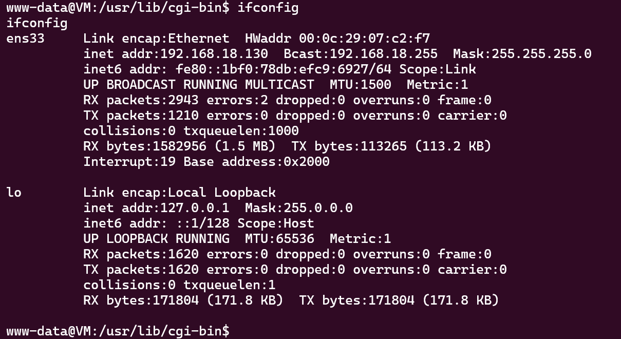 如图我们在服务器端(ip:172.22.221.148)进行ifconfig指令,得到的ip是192.168.18.120,即客户端ip。说明攻击成功。