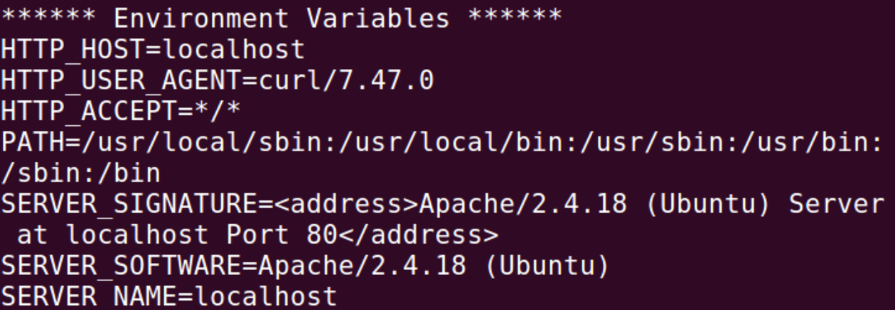 注意这里我们可以发现,http请求头中User-Agent字段显示的是curl/7.47.0,说明此时客户端是curl;服务器响应后打印的环境变量中有一个HTTP_USER_AGENT,它的值与User-Agent一样。由此可知,Apache服务器从HTTP请求头中获取到了User-Agent的信息,并将其赋值给了名为HTTP_USER_AGENT的环境变量。当Apache服务器创建子进程(bash_shellshock)执行CGI程序时,它会传递该变量以及其他环境变量给CGI程序。
