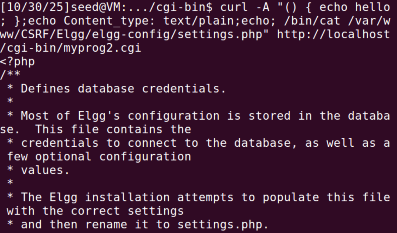如图使用/bin/cat /var/www/CSRF/Elgg/elgg-config/setting.php查看其内容