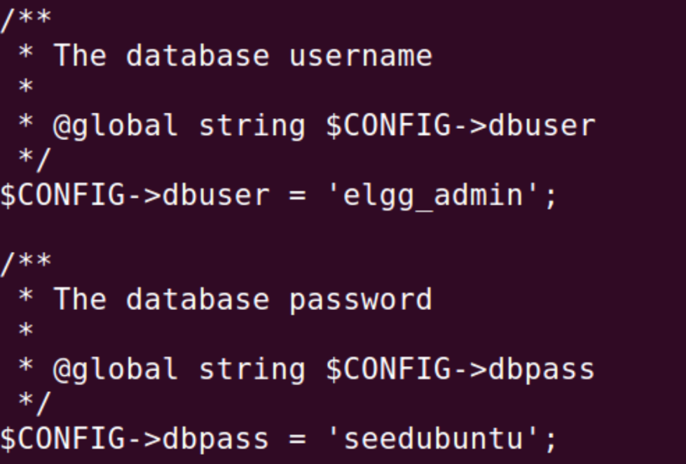 如图显示了该数据库的用户名是"elgg_admin",密码是"seedubuntu"