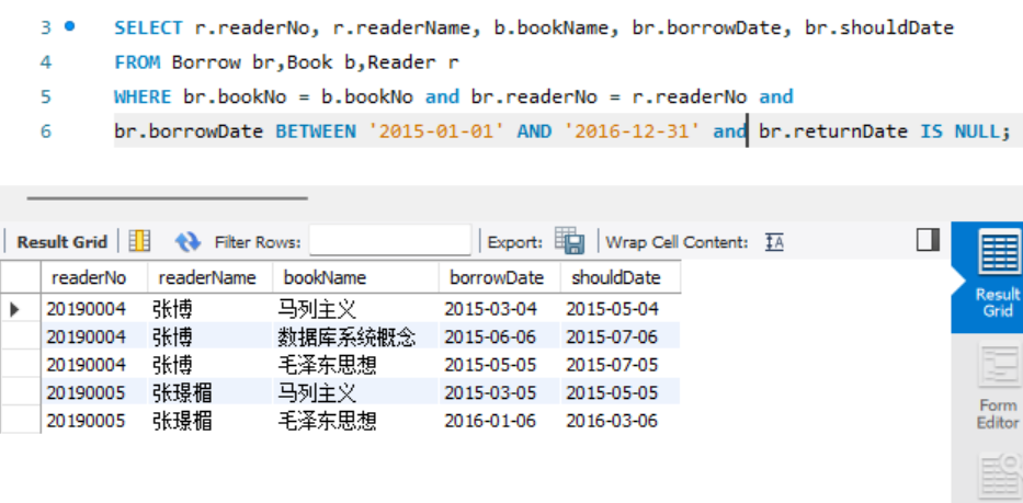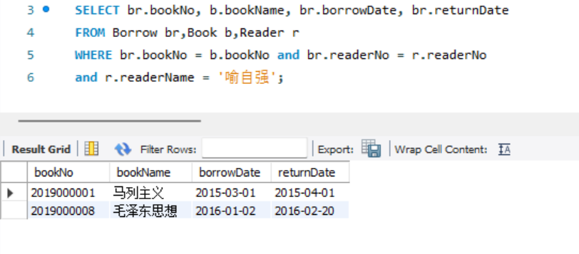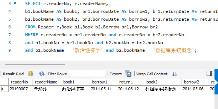- 查询既借阅过"政治经济学"图书又借阅过"数据库系统概念"图书的读者编号、读者姓名以及这两种图书的图书名称、借书日期和归还日期。