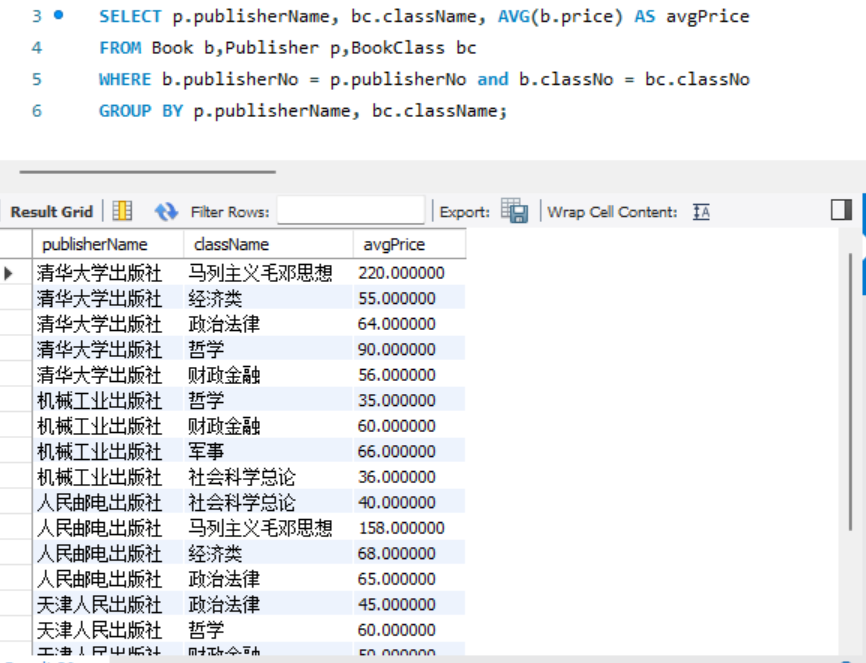 - 查询每个出版社出版的每种类别的图书平均价格,要求显示出版社名称、图书类 别名称和平均价格。