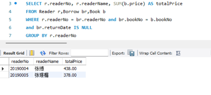 - 查询在借图书的总价不低于200元的读者编号、读者姓名和在借图书总价。