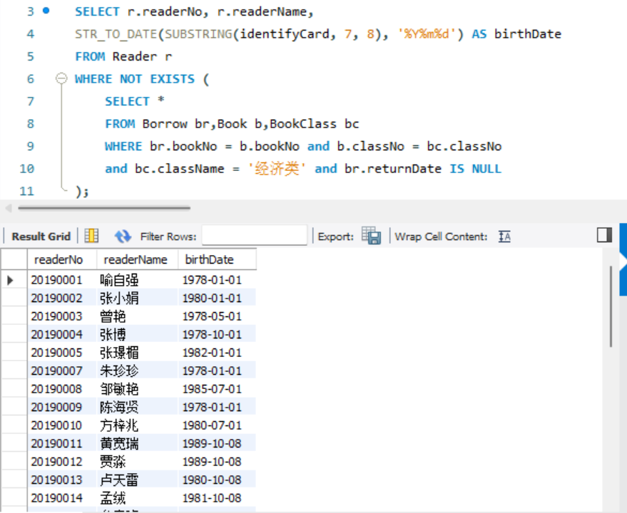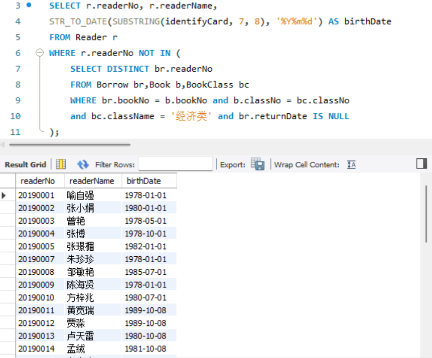 - 查询目前没有在借"经济类"图书的读者编号、读者姓名和出生日期(分别使用IN 子查询和存在量词子查询表达)。