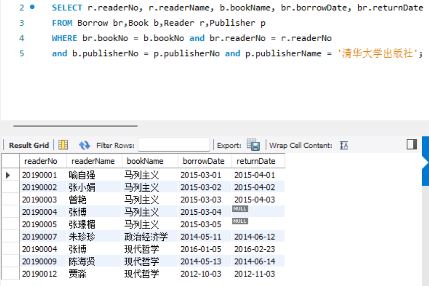 - 查询借阅了清华大学出版社出版的图书的读者编号、读者姓名、图书名称、借书日期和归还日期。