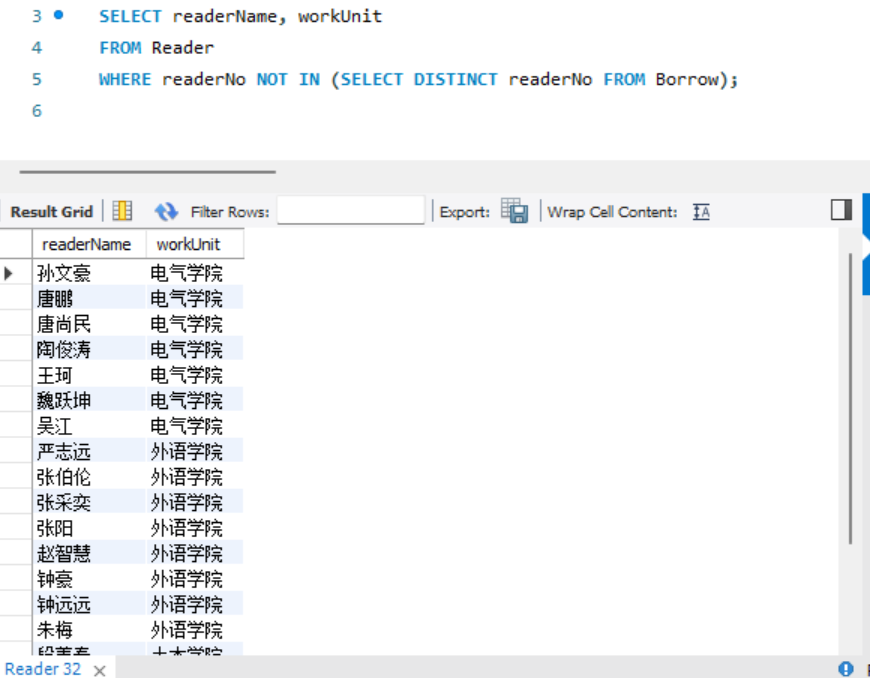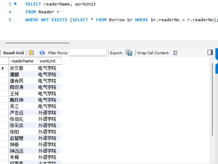 - 查询从来没有借过书的读者姓名和工作单位(分别使用IN子查询和存在量词子查询表达)。