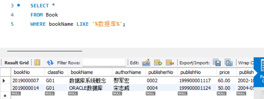 - 查询图书名中含有"数据库"的图书的详细信息。