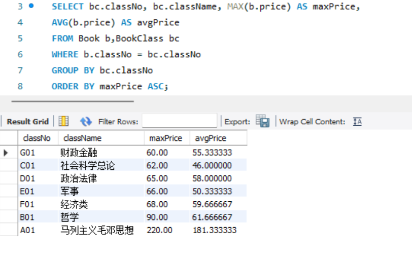 - 查询每种类别图书的分类号、分类名称、最高价格和平均价格,并按最高价格的升序输出。