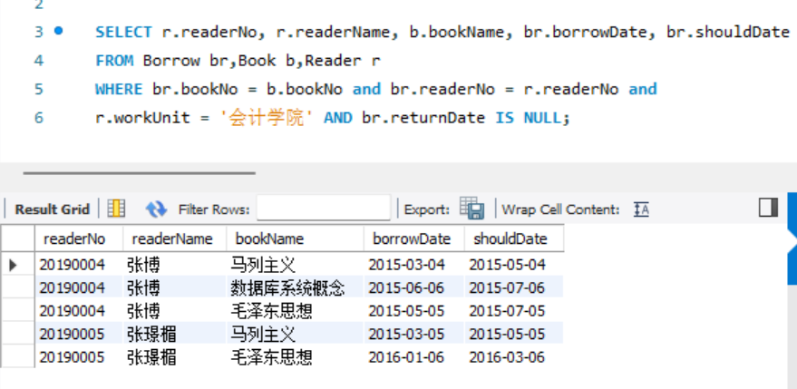 - 查询会计学院没有归还所借图书的读者编号、读者姓名、图书名称、借书日期和应归还日期。