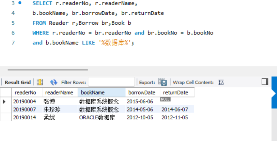 - 查询借阅过图书名称中包含"数据库"的所有图书的读者编号、读者姓名以及他们所借阅的这些图书的图书名称、借阅日期和归还日期。