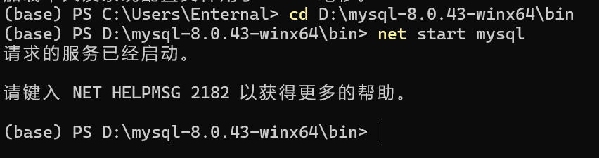(base) PS D:\mysql-8.0.43-winx64\bin> net start mysql发生系统错误 5。