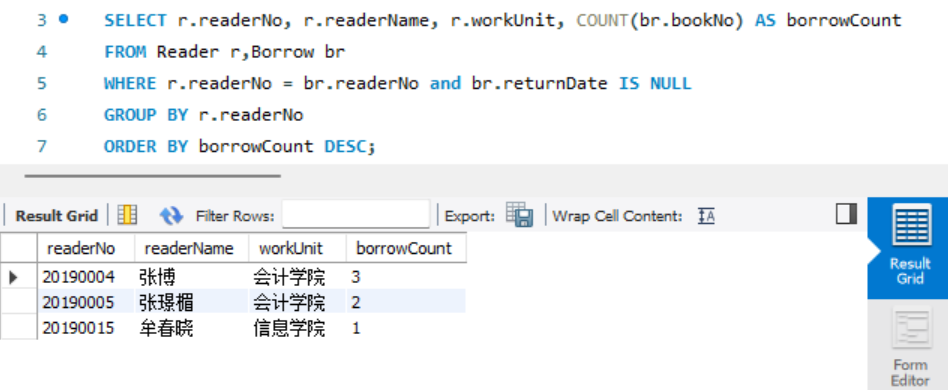 - 查询每个读者在借(即借阅未归还)的图书数量、读者编号、读者姓名和工作单位, 并按借书数量的降序排序输出。