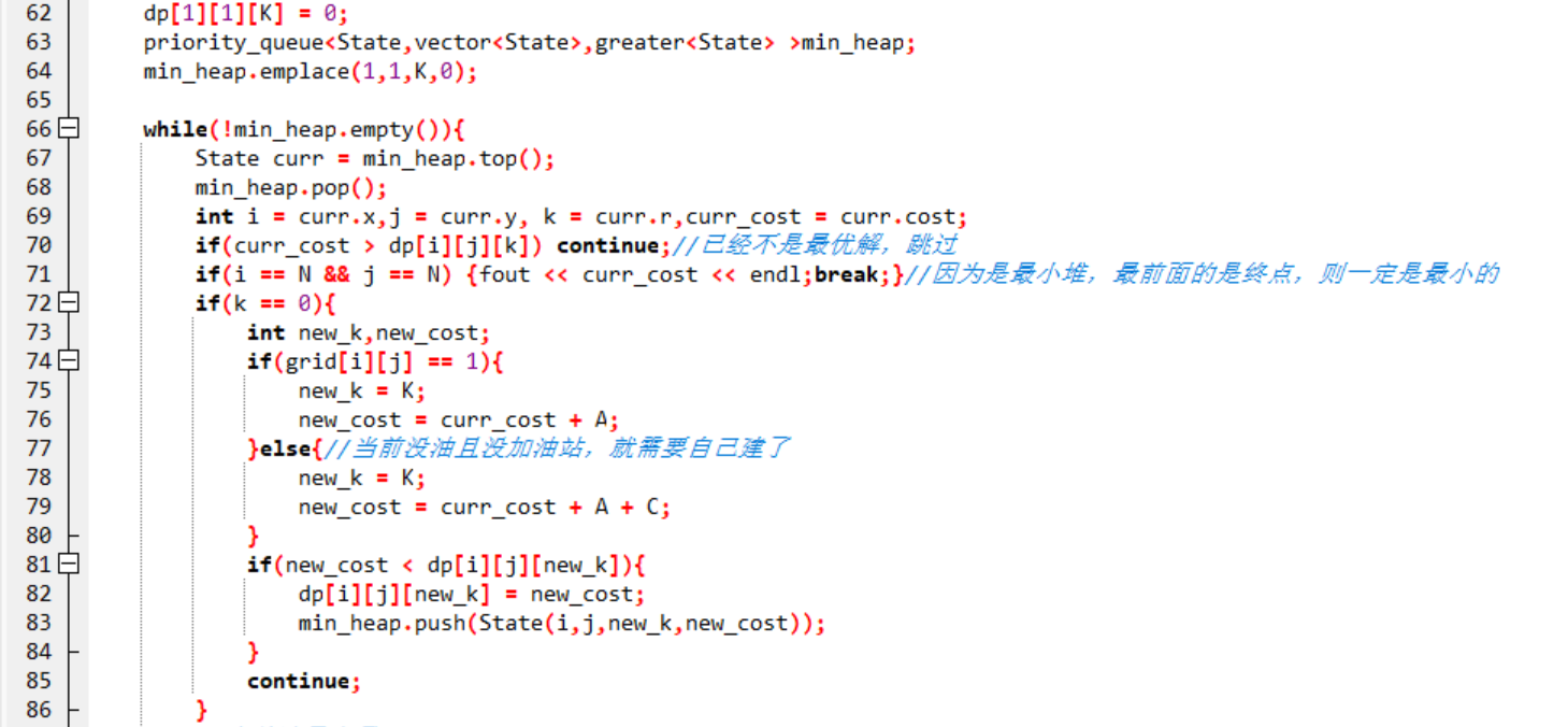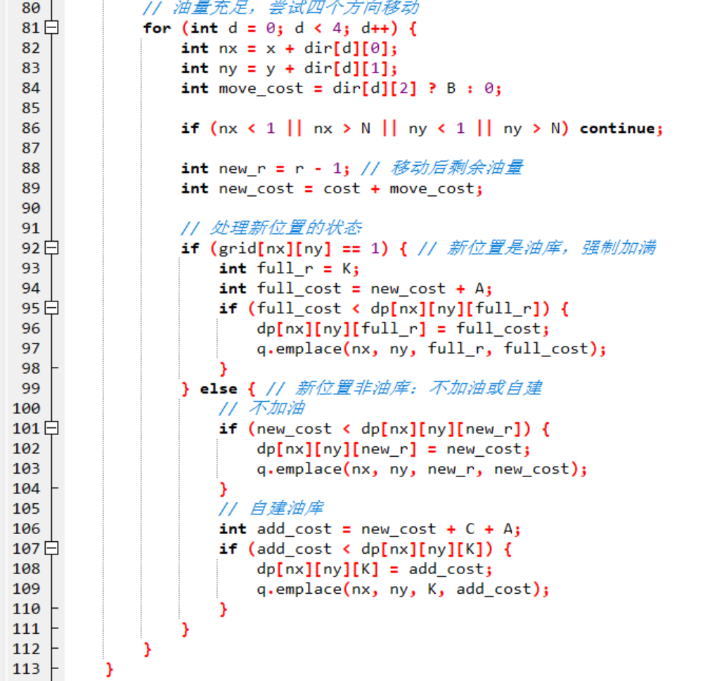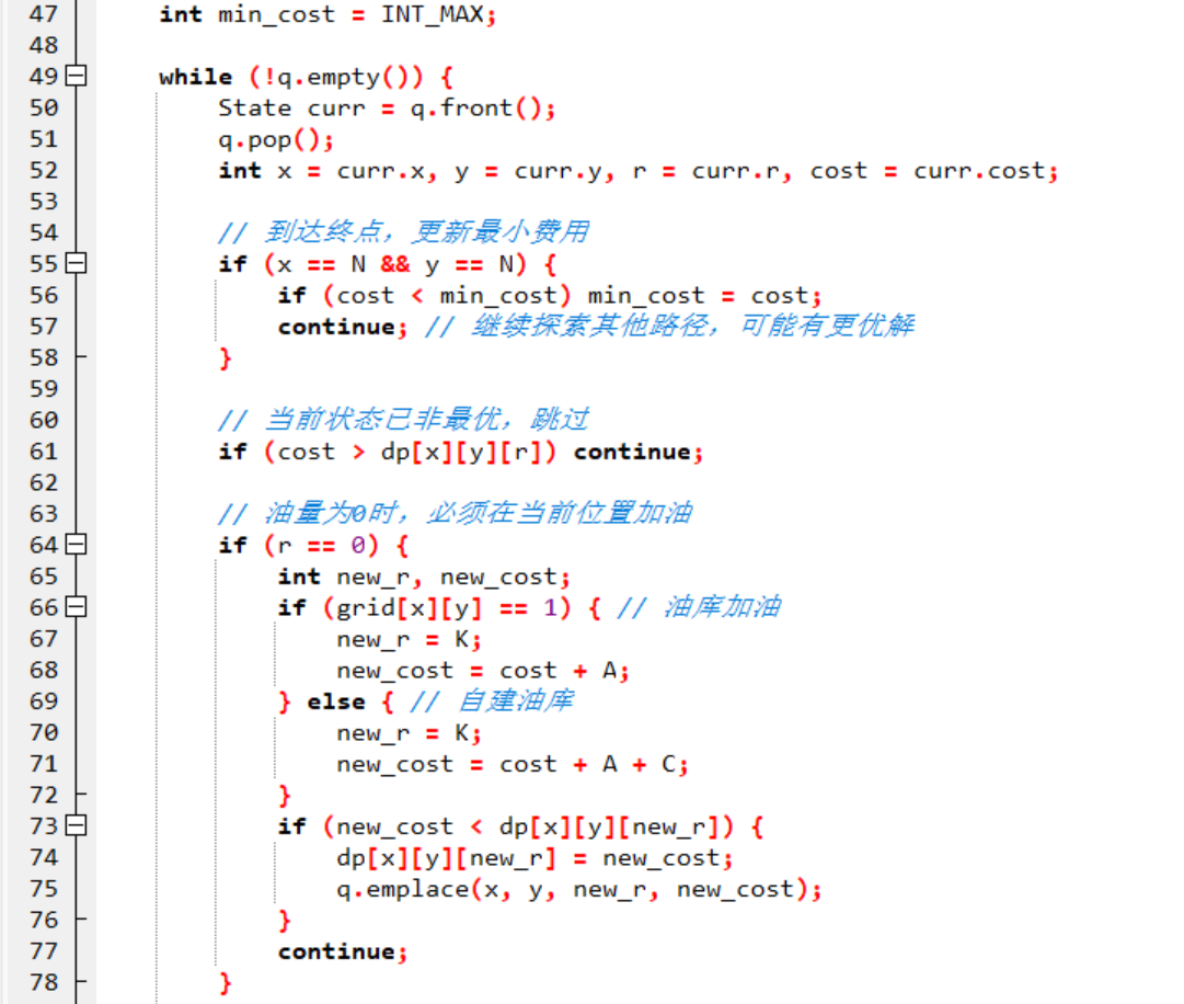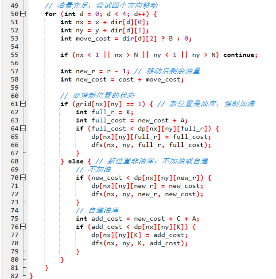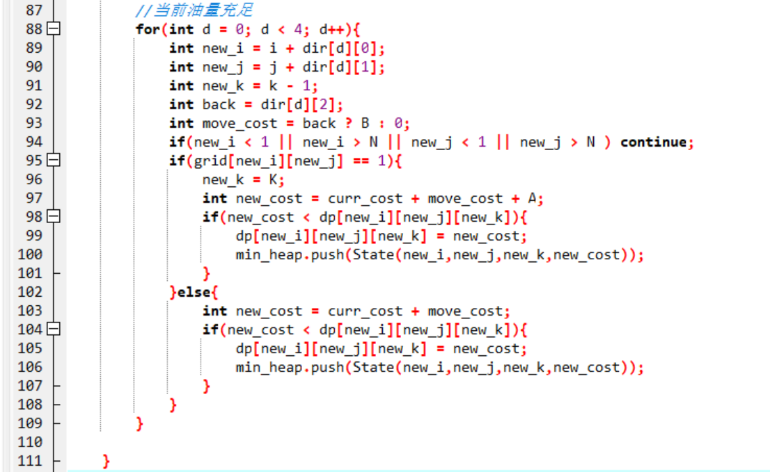 时间复杂度:O (N²・K・log (N²・K))。状态总数为 N²・K(每个坐标 N×N,油量K+1个状态),优先队列每次操作复杂度为 log (状态总数),每个状态扩展 4 个方向(O (1))。