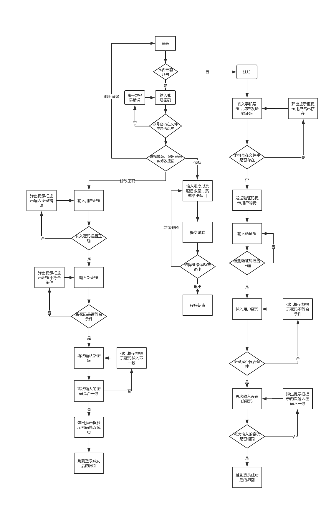 本次的结对项目相较于个人项目来说无疑工程量要较大一些,因此在文章的开头我想想附上一个还出题软件的流程图,好让大家先对该软件有一个整体的认识