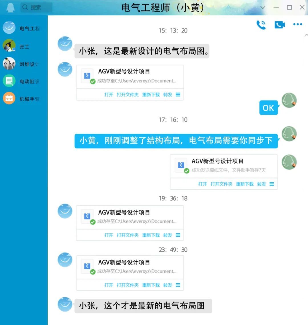 他们当前采用的做法是:小张先绘制一个结构布局图,把图纸打包发给小黄,然后小黄在上面进行电气布局设计,但电气布局设计有干涉时,小黄再把所有的图纸打包发给小张,小张更改后再打包发给小黄。