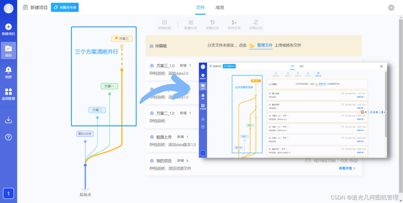 针对熊哥型小天才设计师们,追光几何精准开发了多分支并行版本管理+一键图纸版本对比功能。设计师在一个设计方案的基础上有了新的灵感,可以创建一个分支,将原有方案复制出来进行新的设计,一个分支就是一个方案。确定最终方案之后可以通过「合并分支」将不同的设计方案整合到一起查看完整效果,优化了版本管理流程。