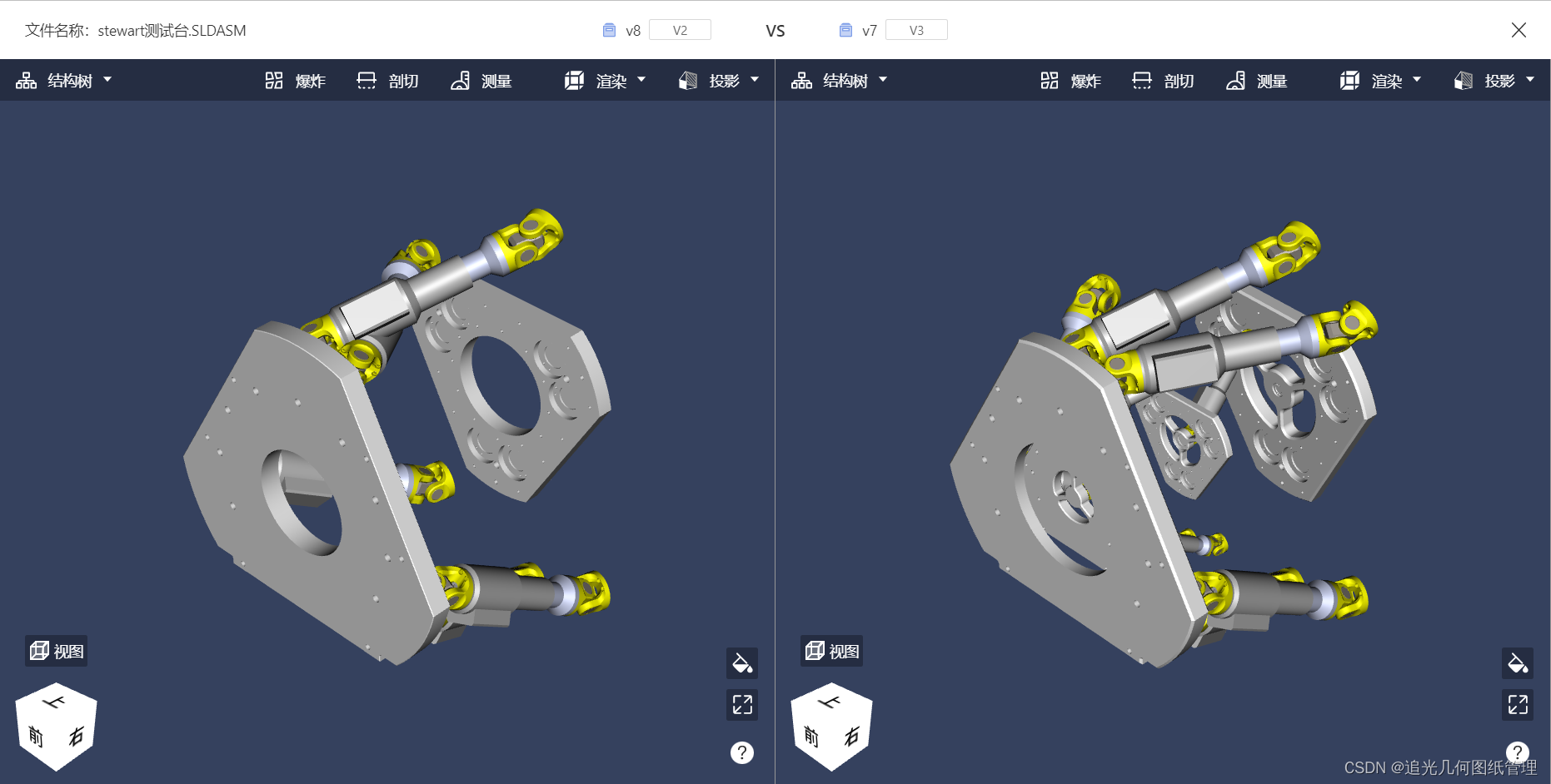 在完成自己的设计任务时,设计师熊哥灵光一现,突然为自己的设计想到了几个绝妙的可能性,于是他同时推进了三种方案。三个方案完成后,熊哥为自己的几个设计做了测试,发现几个设计在性能上有不同的优势。熊哥想对比三种方案细节,进行分析,集合各个图纸版本的优势。但是三版方案的图纸过于繁杂,时间久了,熊哥也没办法记住太多方案细节,需要一个一个文件进行对比才能找到差异。盯着屏幕几个小时,熊哥眼睛都发疼了。