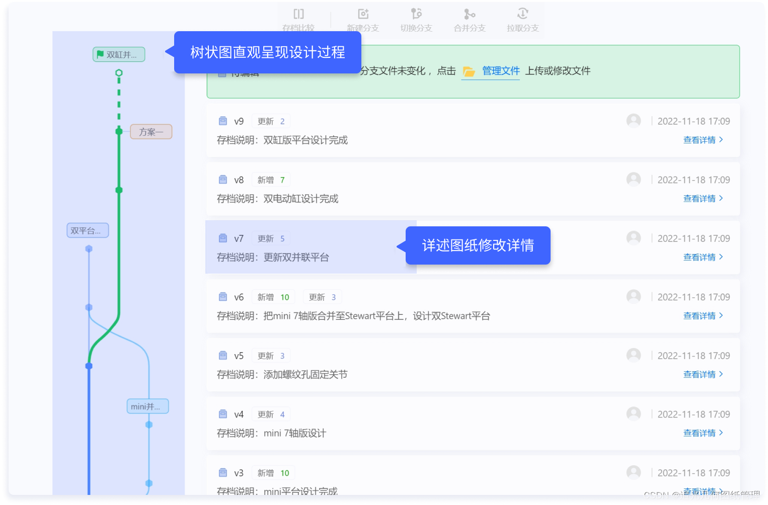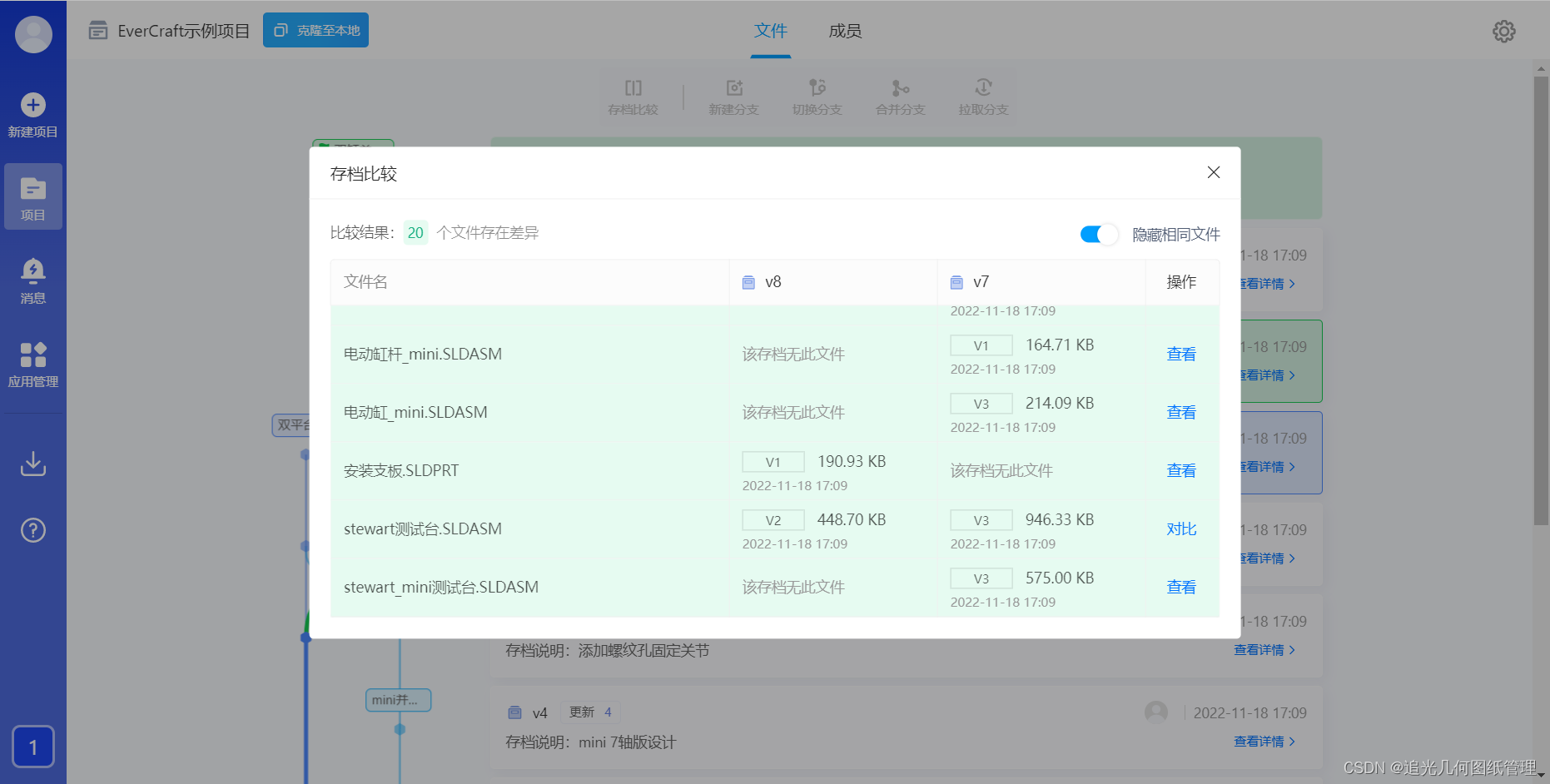 而版本对比功能,可用于两个不同的分支存档之间的信息差异对比。点开全局视图界面,选择需要作对比的节点存档,点击「存档比较」按钮,即可一键对比两个存档图纸版本,直观看出文件数量变化、同一文件的改动版本区别,快速定位被修改的文件。