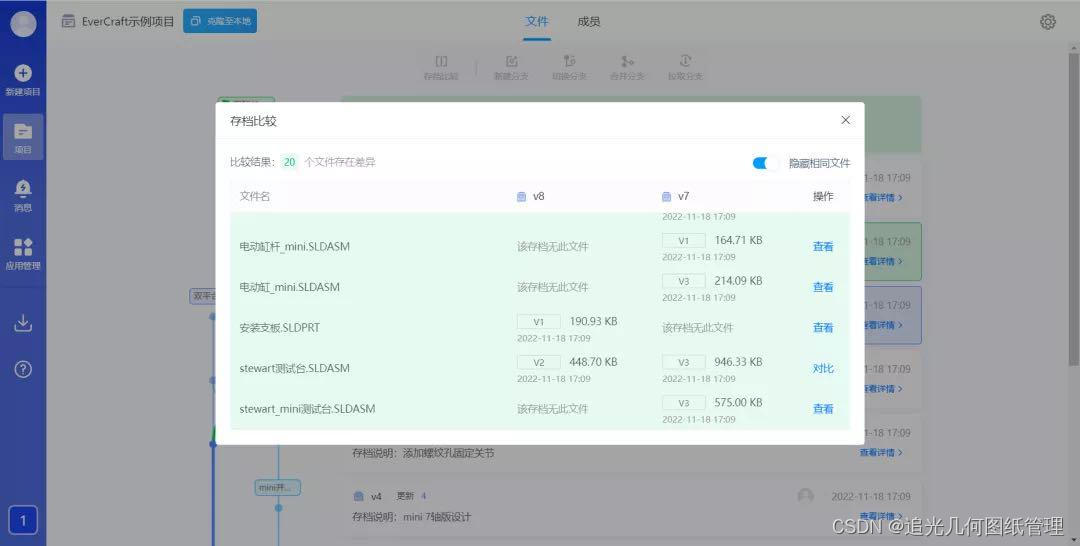 追光几何这个cad图纸管理软件能够对比不同cad图纸版本,当涉及到多个版本的图纸和项目文件时,要对比它们之间的差异通常会比较麻烦,有时还需要解决文件冲突和选择最终版本等问题。为了能够更加有效的进行cad图纸管理,追光几何这款cad图纸管理软件提供了存档比较功能,可以快速比较两个存档之间所有文件的差异,方便用户选择最终版本。通过进入全局视图界面,选择需要比较的节点存档,点击存档比较按钮,就可以直观地看出文件数量的变化以及同名文件的不同版本的区别,并快速定位到被修改的文件,方便用户进行对比和选择。