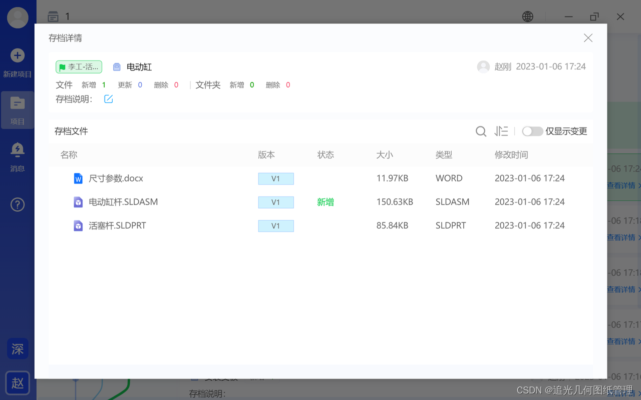 追光几何是一款cad图纸管理软件,能够帮助机械工程师有效地进行cad图纸管理。通过创建项目,设计师可将每次修改后的文件同步至客户端最新存档进行保存。此外,该图纸管理软件还可以智能识别项目文件的变更情况,设计师只需注明存档详情,描述此版本所进行的改动及优化即可。这样一来,追光几何能够清晰地记录下各个版本的图纸信息,让每次修改都有记录可查,帮助设计师更好地进行图纸管理。