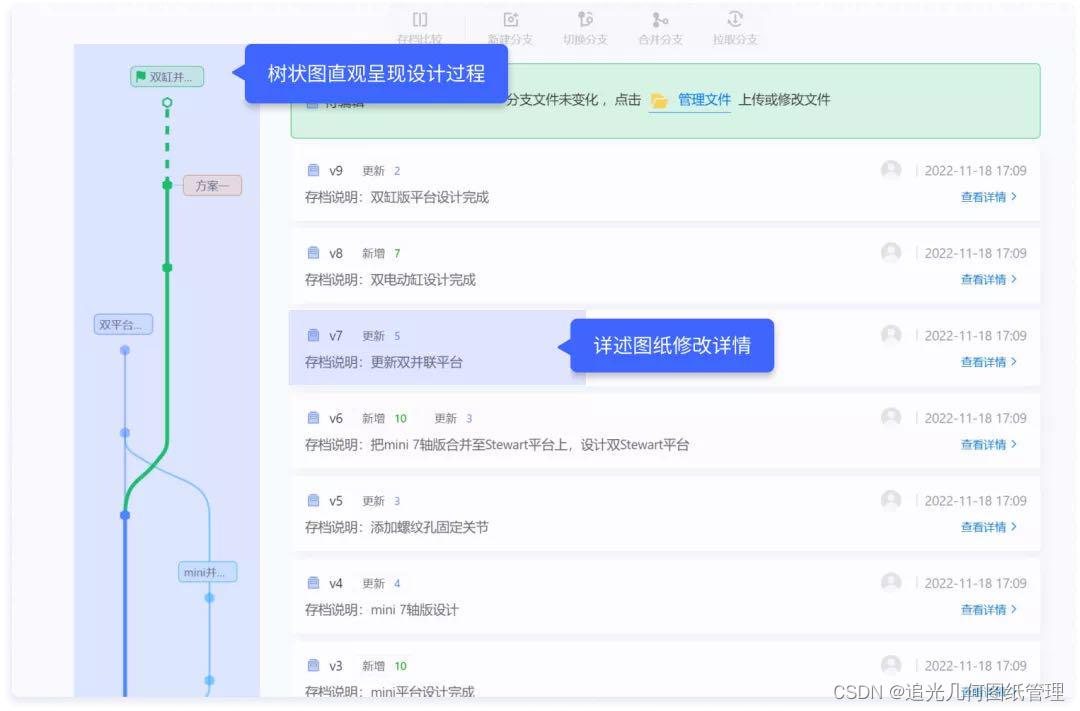 追光几何采用分支存档的方式优化了CAD图纸管理方式。设计师可以使用不同的分支来管理项目的不同部分,并且节点存档能够很好地记录设计逻辑和设计过程。这种方式不仅可以避免使用冗长的文件名称来表示图纸版本,而且可以更加清晰地回顾设计过程,以便更好地理解和审查。此外,通过全局视图和存档详情可以快速定位目标文件,节省时间和提高效率。在追光几何的cad图纸管理系统下,不同版本之间的差异性变得直观和易于比较。
