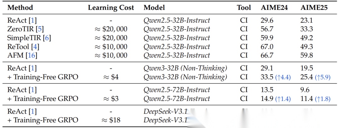 相比之下,传统RL方法(如ReTool、AFM)需数千样本、上万美元训练小模型,而Training-Free GRPO仅花费约18美元。