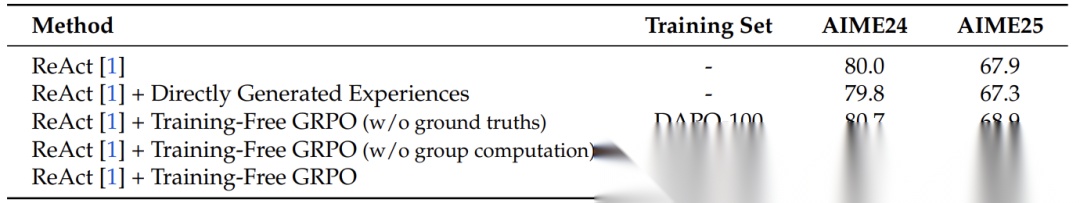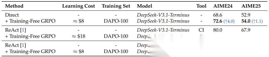 说明:Training-Free GRPO更适合能力强的大模型,因为语义理解与经验总结需要较高的推理能力。