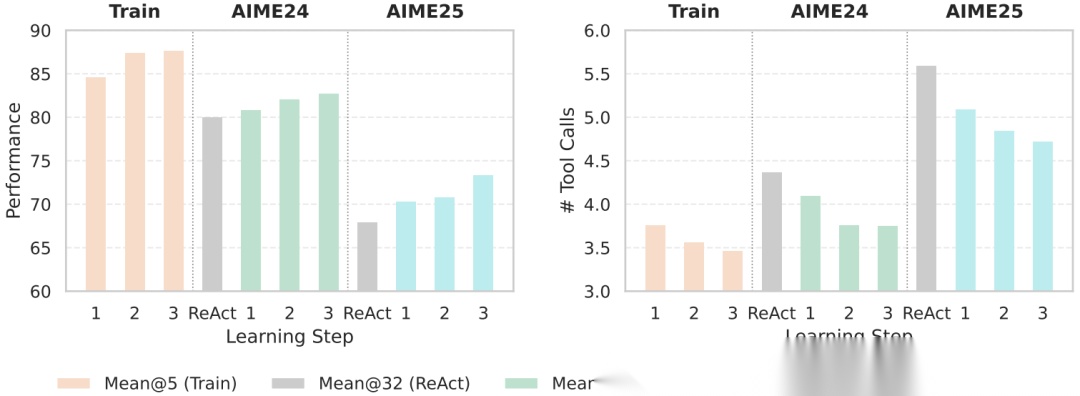 上图展示了学习过程中性能稳步提升,同时工具调用次数减少,说明模型学会了更高效的解题策略。