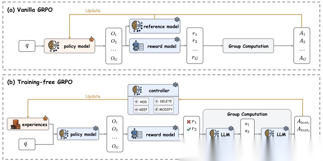 - 传统GRPO更新模型参数,Training-Free GRPO更新上下文经验。