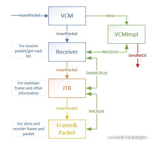 3) vi_channel 开启线程,jitterbuffer对数据包进行处理、数据帧获取、数据包插入,数据包重排等操作;jitterbuffer进行插包处理,同时进行NACKList构建;