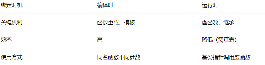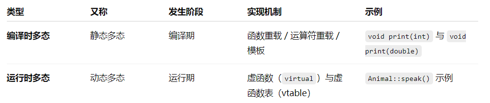 C++多态让同一个接口(函数调用)在不同对象上表现出不同的行为静态多态靠编译器决议(重载、模板),动态多态靠运行时虚表机制(virtual)。