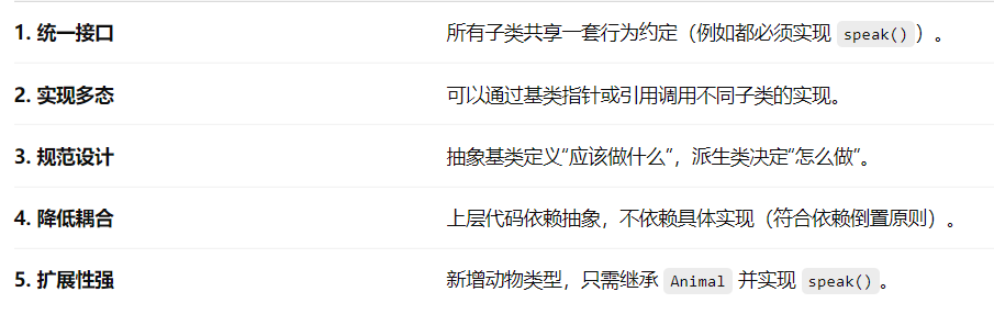 virtual void speak() = 0; // 纯虚函数(只定义行为,不给实现)