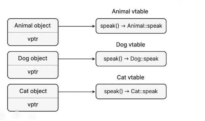表面上都是调用 Animal::speak(),但结果却不同-这就是多态。