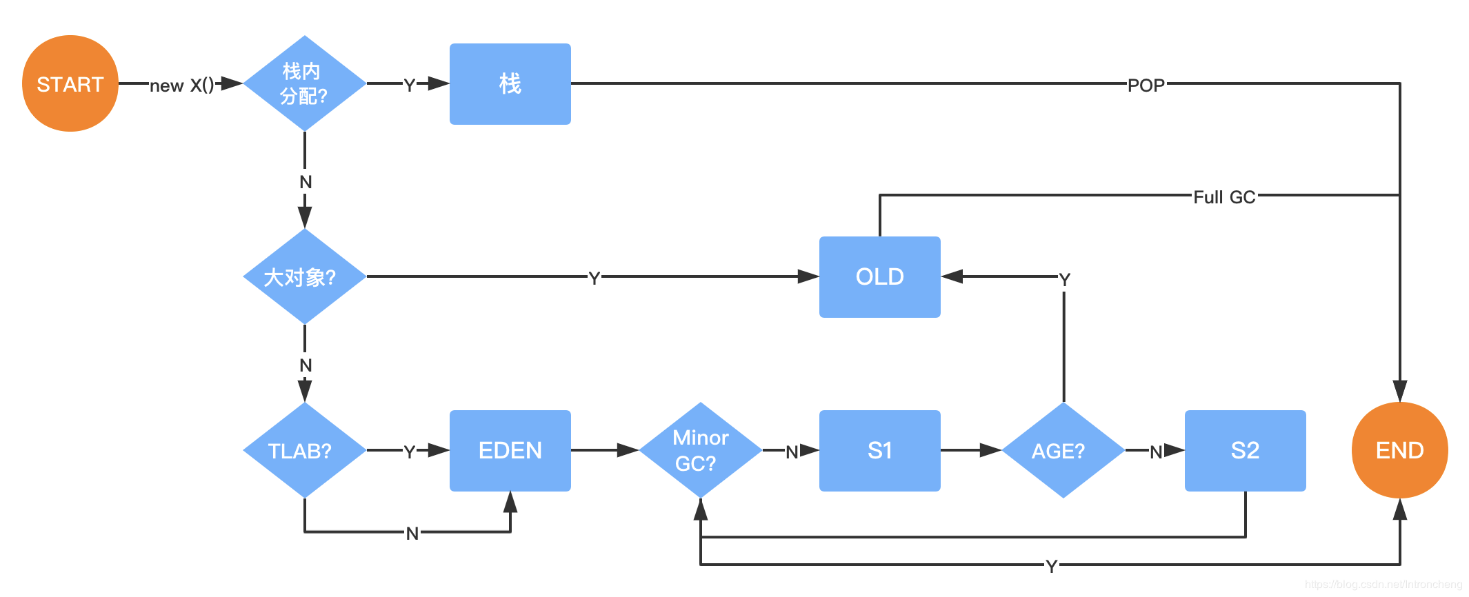 虚拟机遇到一条new指令时,首先将去检查这个指令的参数是否能在常量池中定位到一个类的符号引用,并且检查这个符号引用代表的类是否已被加载、解析和初始化过。如果没有,那必须先执行相应的类加载过程。