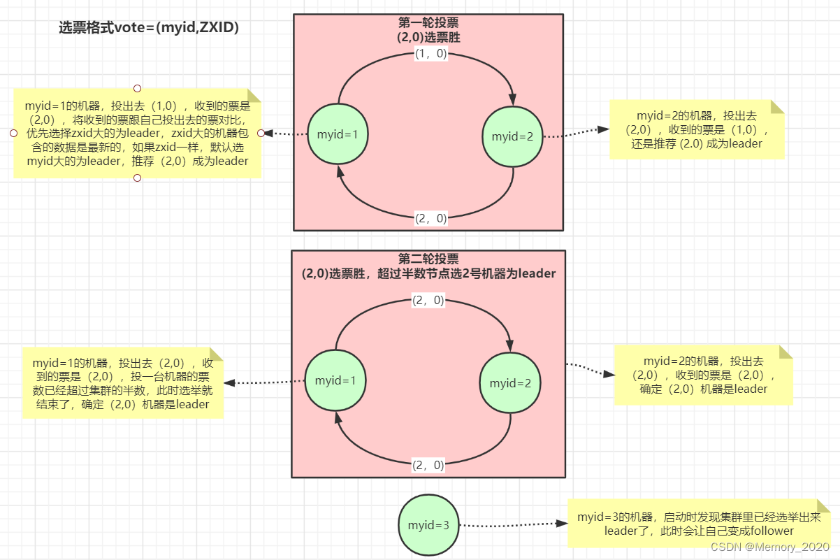 - 投票结果:收到的第一个投票节点成为领导者,其他节点成为追随者。