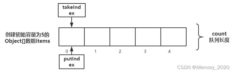 队列基于数组实现,容量大小在创建ArrayBlockingQueue对象时已定义好