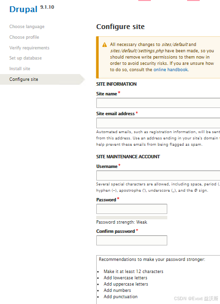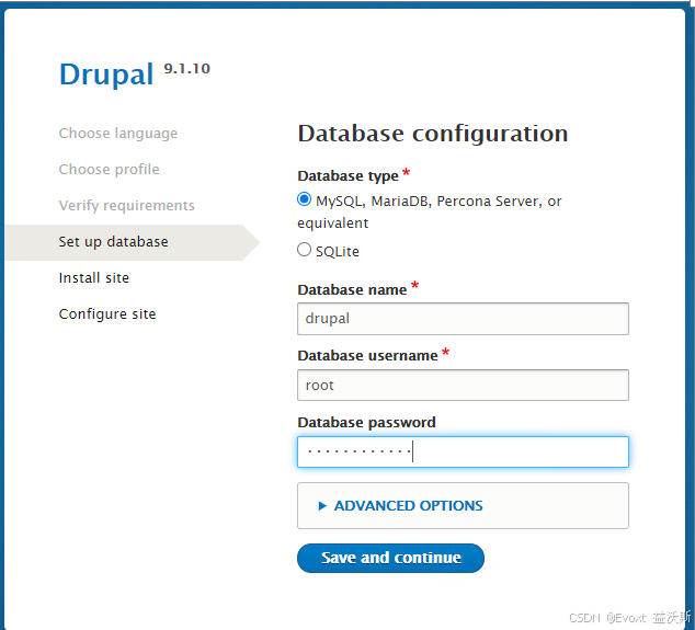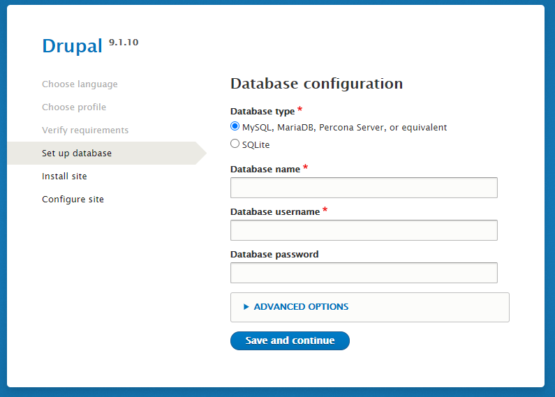 Enter your desired website details and click Save and continue to complete the installation.